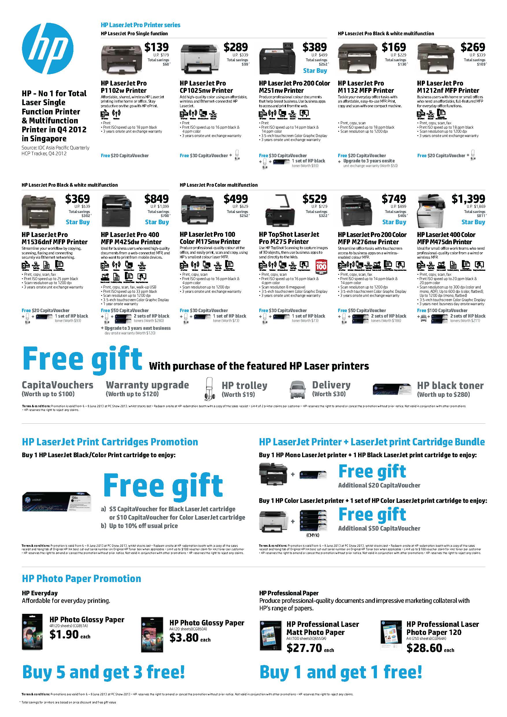 HP will be at PC Show 2013 at Singapore Expo Hall 6, Booth 6003 & 6015, offering the best price and packages for their printers, ink cartridges and other computing accessories. Here are the flyers from HP at PC Show 2013 (Click picture to enlarge):