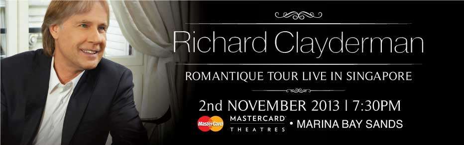 Richard Clayderman Romantique Tour Live in Singapore will take place at the MasterCard Theatres at Marina Bay Sands on 2 November 2013 at 7.30pm. The classically trained pianist is back in Singapore and will perform his hits and music from his latest album Romantique.