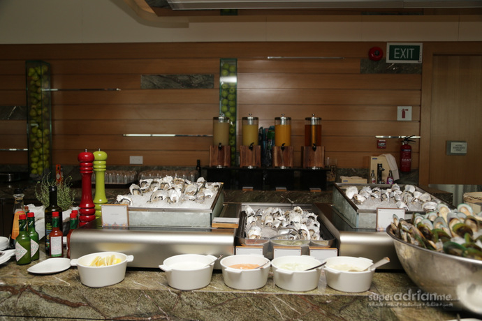 The buffet spread includes sushi and salmon done in various ways, an fresh seafood section offering three types of oysters, lobster, crab and succulent prawns, Suckling Pig, Lobster Mee Goreng, Tom Yum Soup Noodles with Prawns, Steak à la minute as well as a mouth watering dessert station offering green-tea chocolate fondue, ice creams, local delights and other pastries.