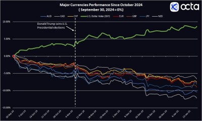 ‘It was always assumed that Donald Trump’s victory in the presidential race would be bullish for the U.S. dollar as his trade and immigration policies were viewed as inflationary. Therefore, the market started to price in that outcome well in advance and the dollar began its ascent one month before the election’, says Kar Yong Ang, a financial market analyst at Octa Broker. Specifically, Trump has explicitly threatened to impose trade tariffs on Eurozone and Canada, which clearly had a bearish impact on their currencies. For example, the Euro, which has a dominant 58% weight in the DXY, has lost more than 8% against the U.S. dollar since 25 September 2024. The biggest losers, however, have been risk-sensitive currencies such as the Australian dollar (AUD) and the New Zealand dollar (NZD) (see the chart below) both of which devalued by more than 10%.