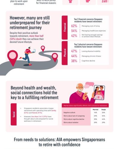 The traditional view of retirement as a period of passive rest is rapidly evolving, aligning with the national call for seniors to remain engaged and contribute meaningfully,” said Irma Hadikusuma, Chief Marketing and Healthcare Officer, AIA Singapore. “Singapore residents are increasingly envisioning a purposeful and active post-career life, yet our study reveals many are not adequately preparing for this new reality. This highlights critical areas where more support and education are needed – particularly around financial readiness, physical health, and crucially, the often-overlooked power of social connections – all vital pillars for the holistic well-being the government also champions.”