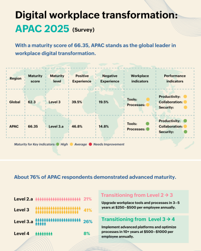 APAC’s workplace experience is closely tied to digital transformation, with organizations that modernize their tools reporting higher maturity scores and improved employee sentiment. The study explores key trends in workplace maturity, tool upgrades, and their impact on employee experience: