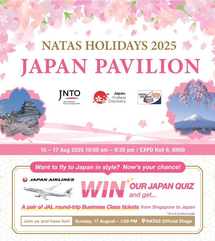 The Japan Pavilion at this year’s NATAS Fair is where you’ll want to make a beeline for. Get insider tips from Japan travel experts at the Travel Information Counter to help you plan your next foodie trail, cultural escape or nature adventure. Try your luck with omikuji, a fun fortune slip that points you to one of Japan’s 47 prefectures. Or pen your travel wishes on a traditional ema plaque and hang it up alongside others on a colourful display. Don’t miss the stage action too. Join the Japan Quiz Contest on 17 August (Sunday, 1pm) for a shot at winning return Business Class tickets to Japan. And get a sneak peek into what’s coming at EXPO 2025 Osaka during a live broadcast on 15 August (Friday, 4pm) and 16 August (Saturday, 1pm).