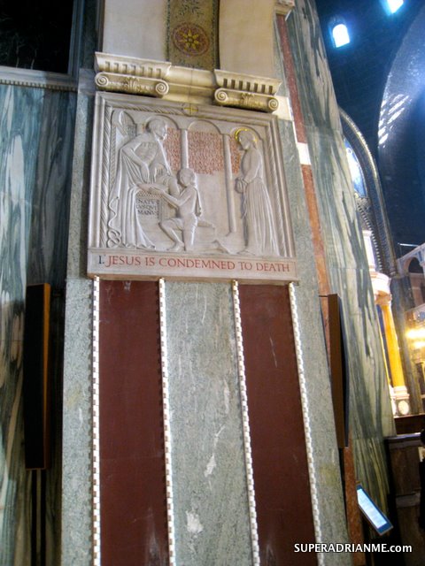 The awesome interior of the Cathedral, although incomplete, contains fine marble-work and mosaics. The fourteen Stations of the Cross, by the sculptor Eric Gill, are world renowned.